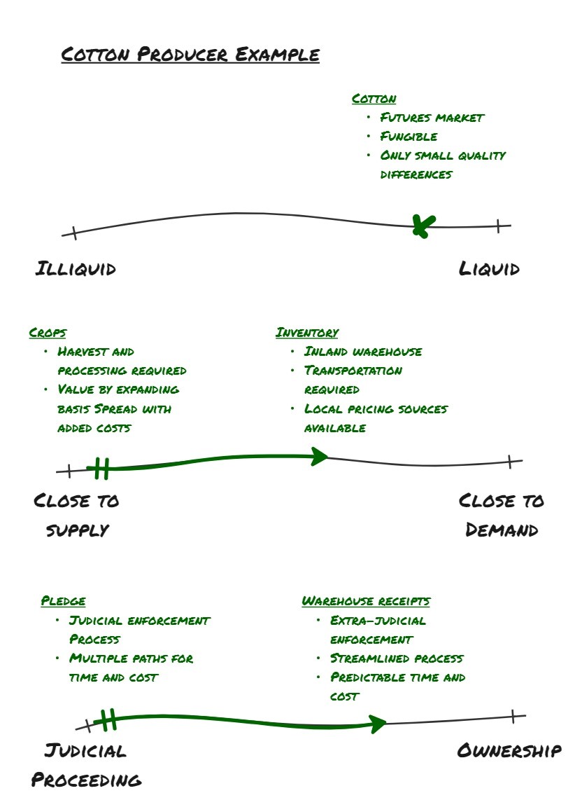 The commodity at hand is cotton. There is a liquid and traded futures market for cotton, mainly underpinned by the ICE Cotton No. 2 contract. Quality of cotton can differ around the contract specifications, but not to a degree that we’d consider these different subtypes. Rather the quality differences result in predictable premiums/discounts. In a practical scenario, the cotton can likely be sold in its entirety without having to search for different buyers due to differences in specifications, making it fungible. The commodity location is variable, moving from crops in formation to cotton held in inventory. Similarly, the legal structure changes from a judicial pledge over crops to extra-judicial warehouse receipts. Here’s what that looks like, the green marks denoting each aspect of this collateral: