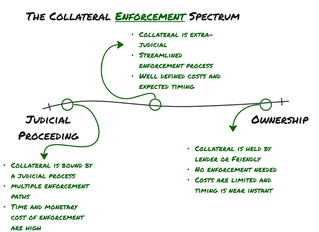 We consider the available legal structures across a spectrum, from outright ownership to liens subject to a judicial process when they need to be enforced. The closer the structure is to ownership, the higher the collateral quality. We will describe structures along this spectrum starting from closest to ownership and moving further away towards traditional structures. Our focus remains strictly on the timing and cost of enforcement, as it pertains to the collateral.