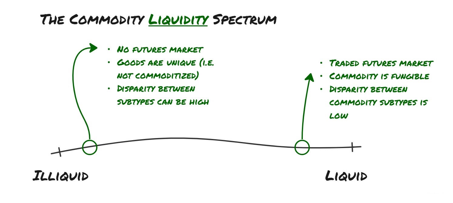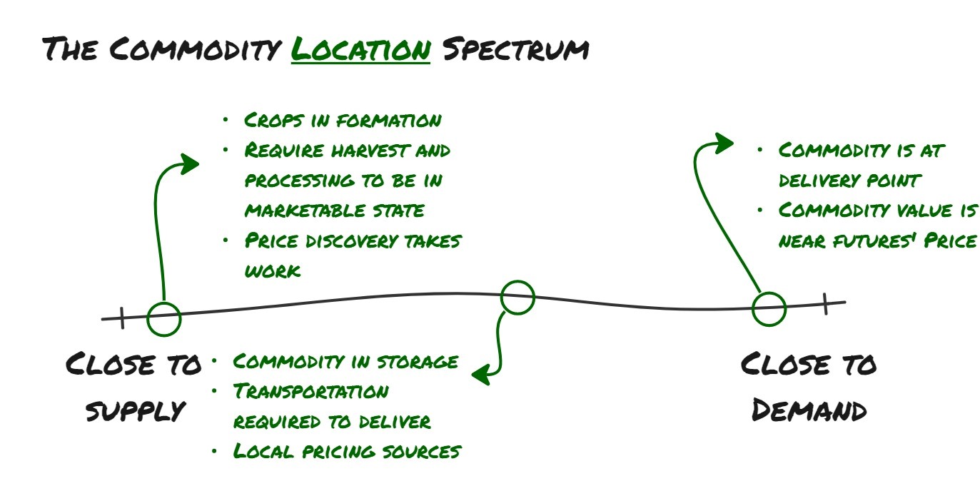 (2) Commodity Location: Those commodity experts reading “location” will first think of basis spreads. That is, the difference in price between a commodity in two different locations. A ton of soybean in Mato Grosso is not worth an equal amount as the same ton of soybean at the Port of Santos. The difference being the cost to move the goods between locations. In other words, bringing the goods further from the point of supply and closer to point of demand has value. In our analysis of location, we will expand this idea of basis from marketable goods held as inventory to also include commodities that are in formation: commodities that are still crops, not yet fully grown. The reason location is important is to properly value and price commodities held as collateral, but also to assess the potential frictions of selling the goods. Like with our spectrum of liquidity, we think of location on a spectrum from its point of supply to its point of highest demand. The closer we are to demand, the higher the collateral quality.